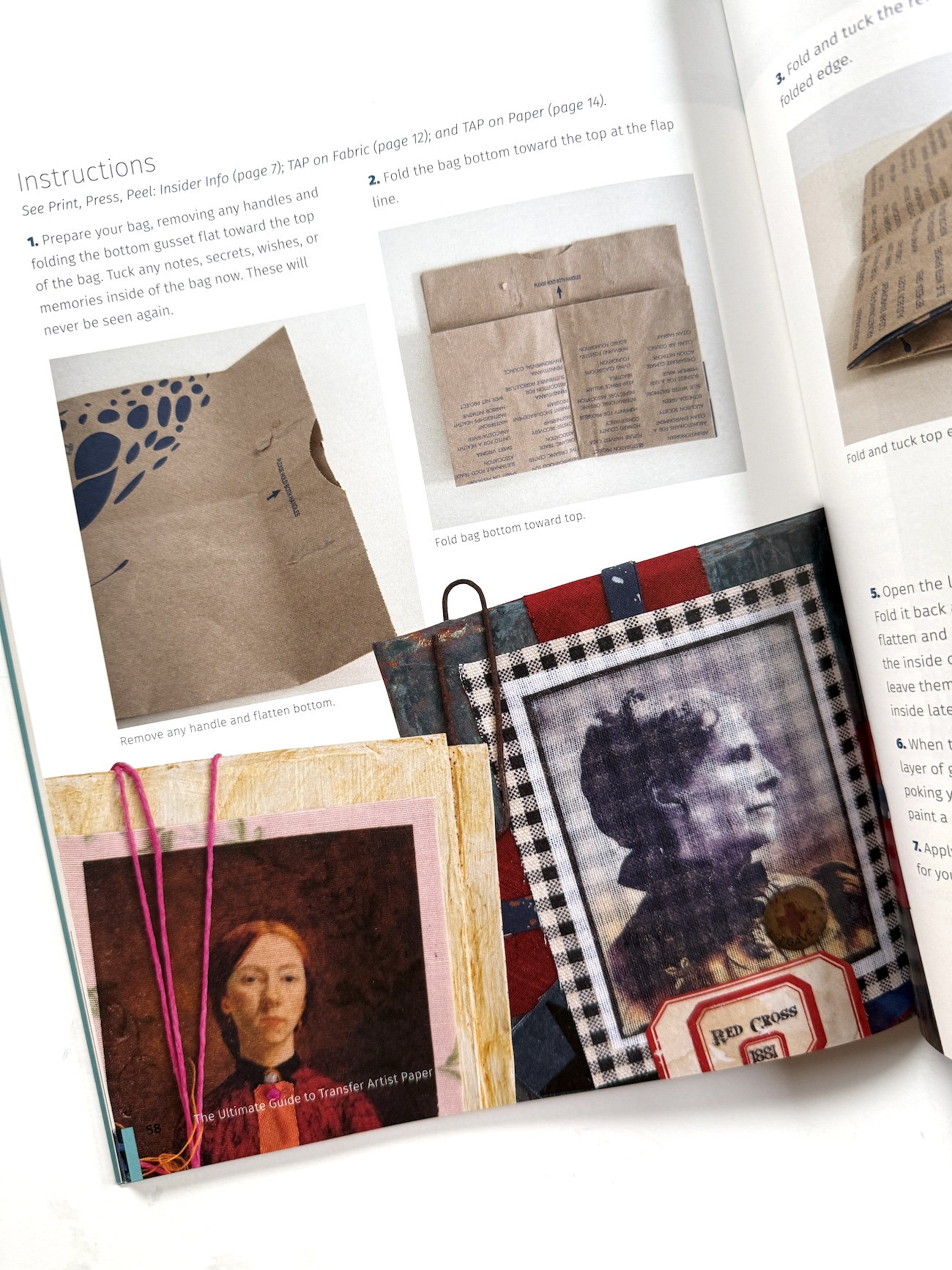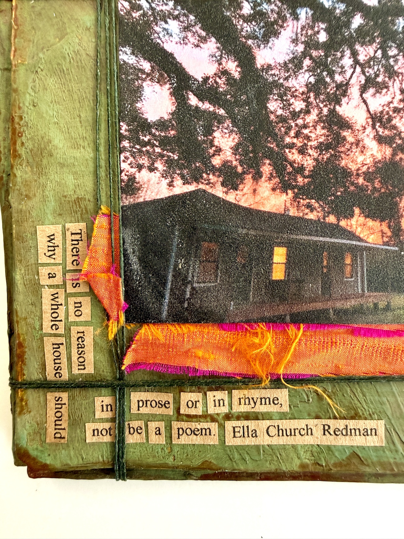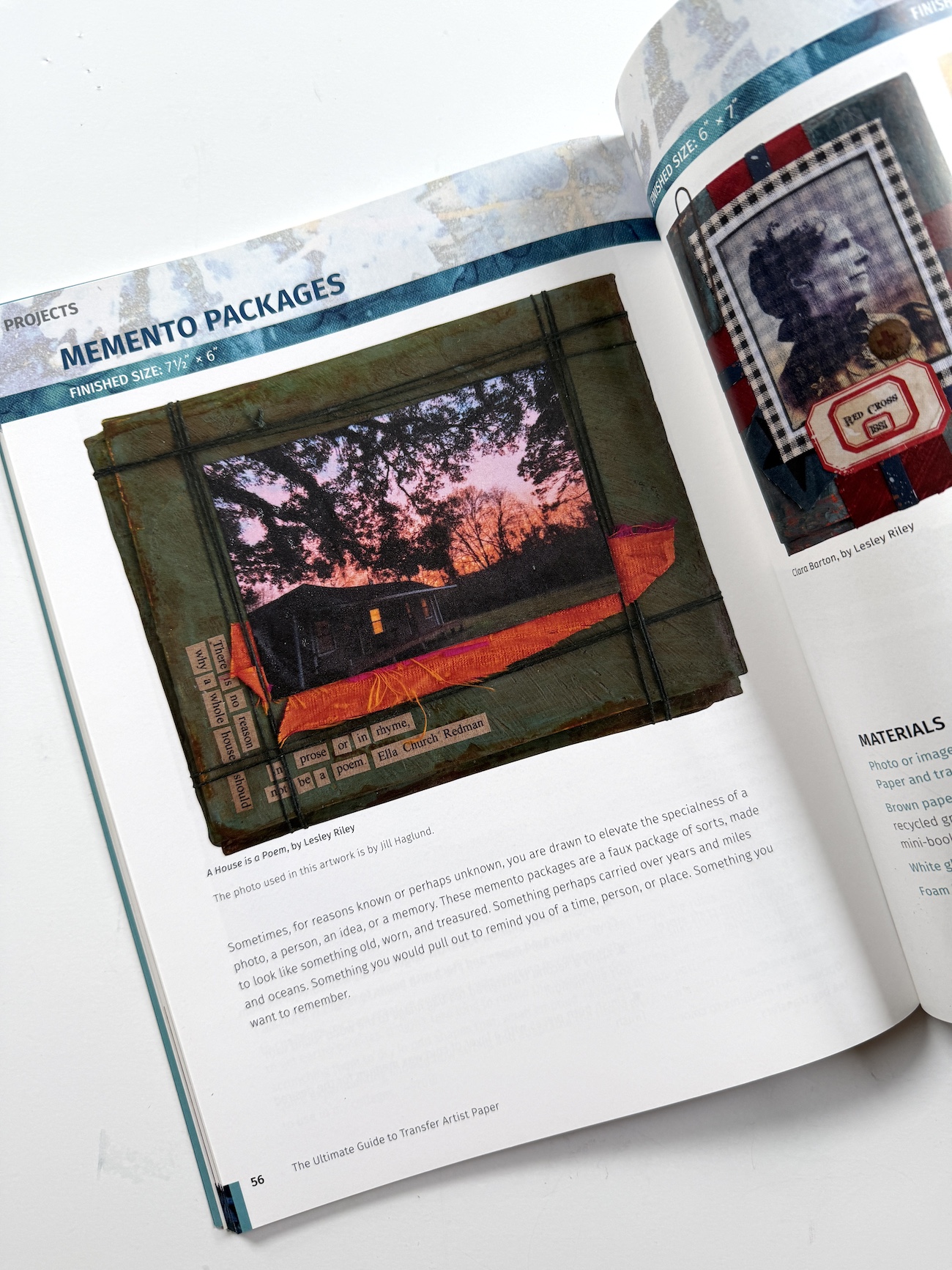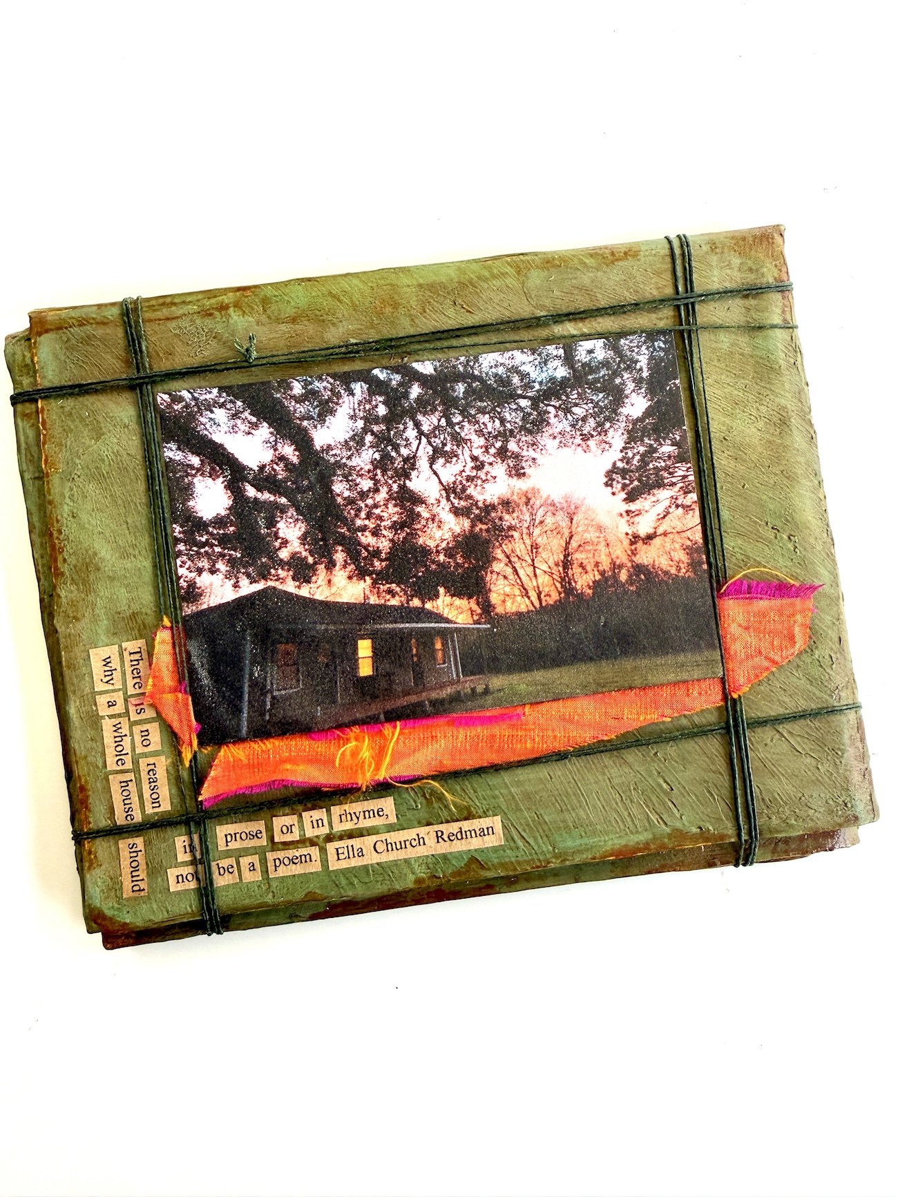 Faux book, painted, aged, collaged, wrapped with waxed linen. Transferred photo , added quote 7.5×6″. As seen in The Ultimate Guide to Transfer Artist Paper. See gallery photo for quote.