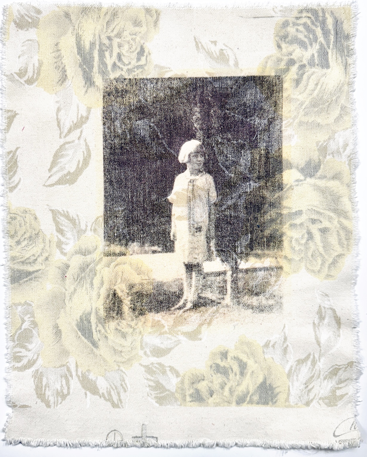 Vintage photo of young girl transferred onto woven cotton -10.5×13″
