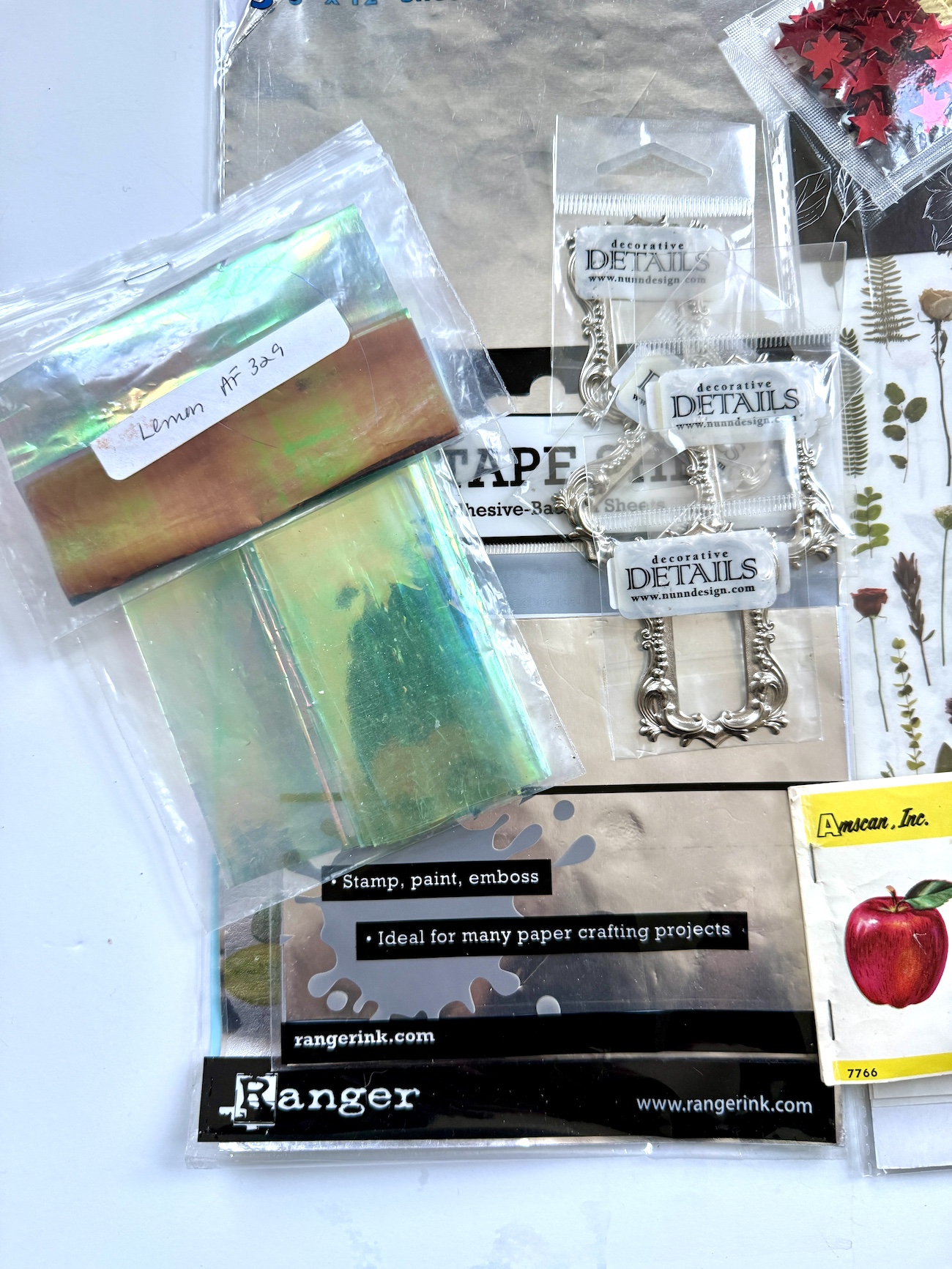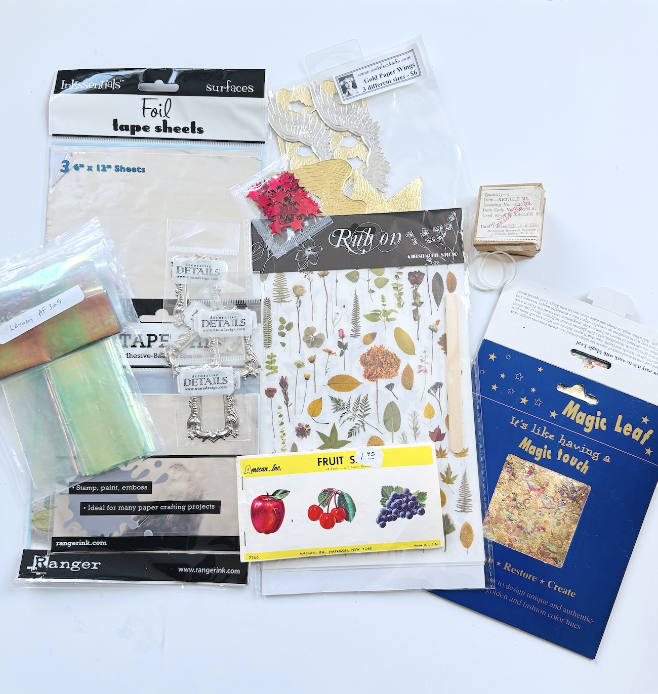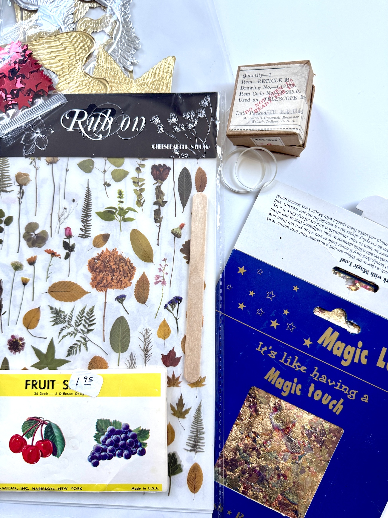 Includes Ranger silver foil sheets, a mix of iridescent papers, gold embossed wings, 4 silver mini frames, Magic Leaf, leaf rub-ons, vintage fruit stamps, 2 – 1″ glass Reticles (glass) in vintage box, red stars.