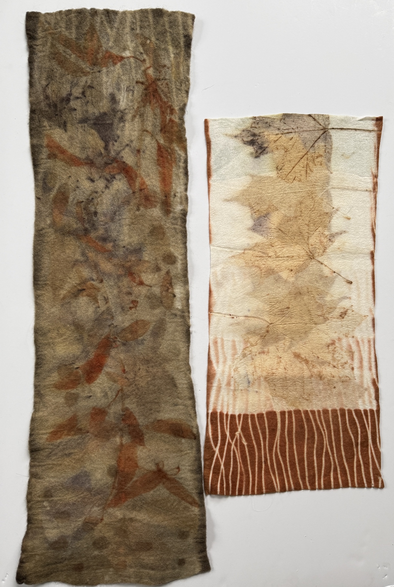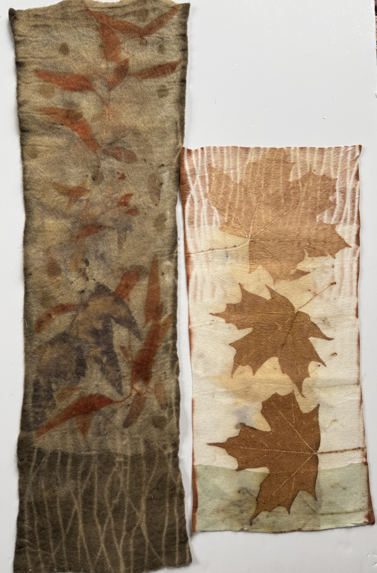 Large one is 7-9″ wide and 27″ long. White and gold one is 8.5″ wide and18.5″ long. Double sided prints. So many possibilities await these two lovely eco-prints