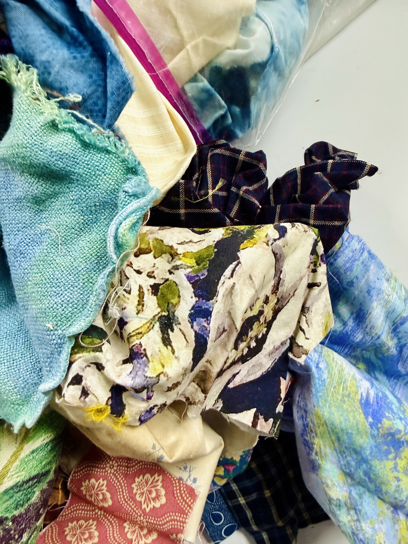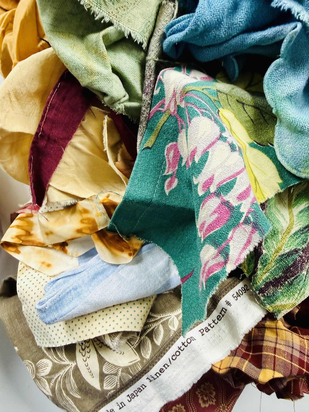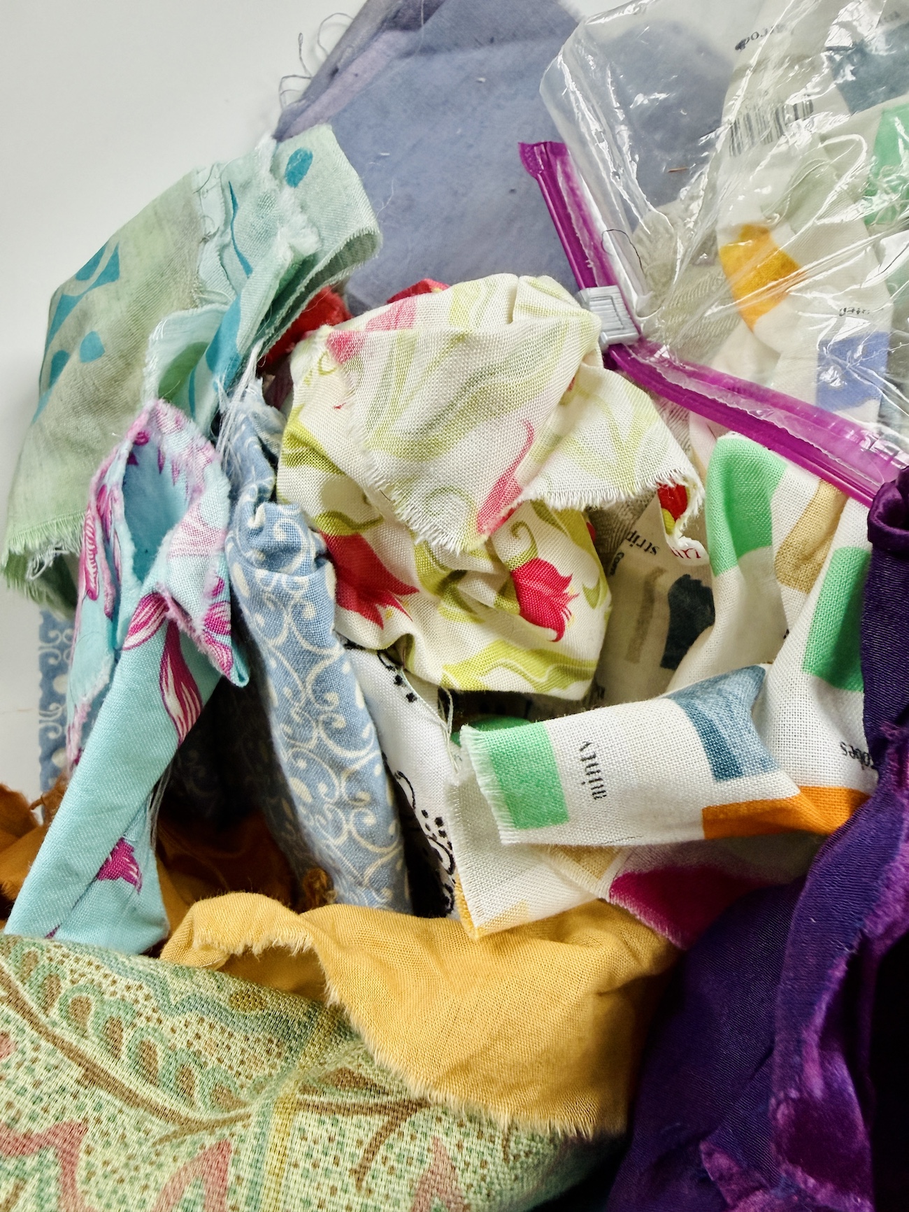 Over 2 lbs of a variety of fabric scraps, including large pieces = more fabric – woven, cotton, designer, overdyed, stamped, barkcloth, vintage, and of course, quilting fabric. The perfect variety for scrap quilts, journaling, collage, and more.