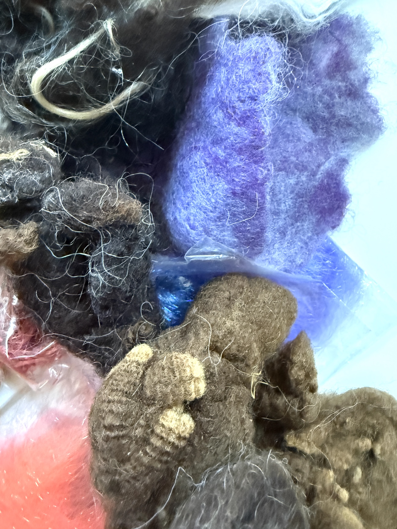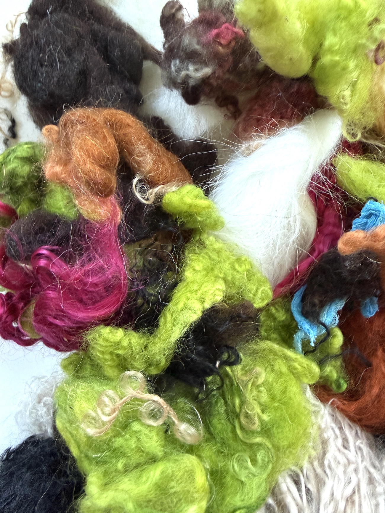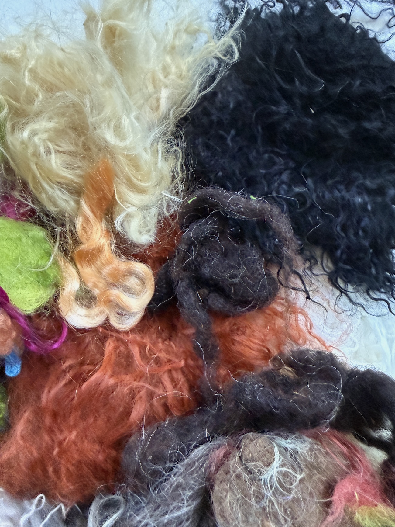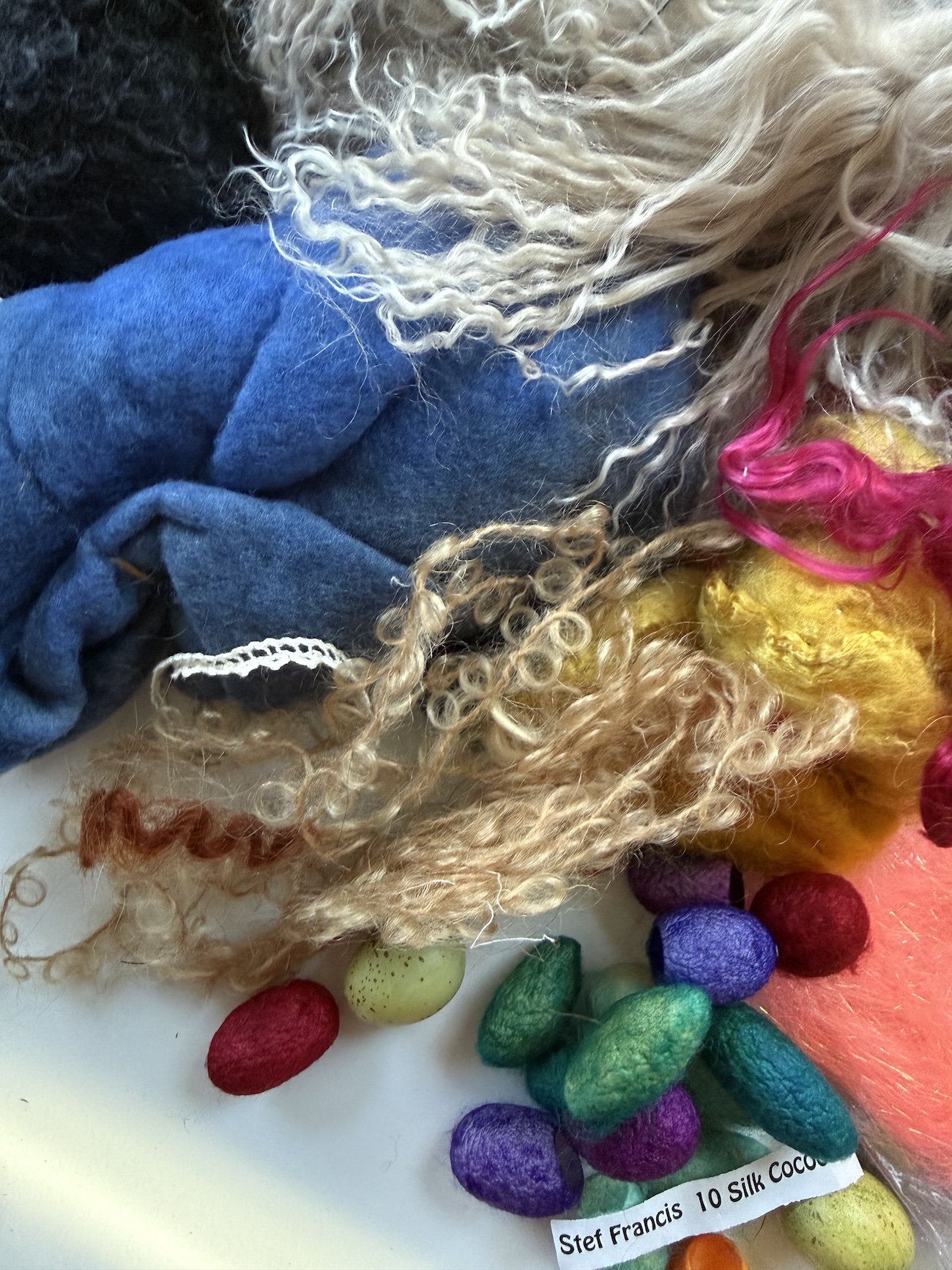 Wool, felted wool, doll hair, dyed silk cocoons, a bit of Angelina (synthetic) – all perfect for fiber artists, felters, spinners, weavers, dollmakers, knitters and mixed media artists.
