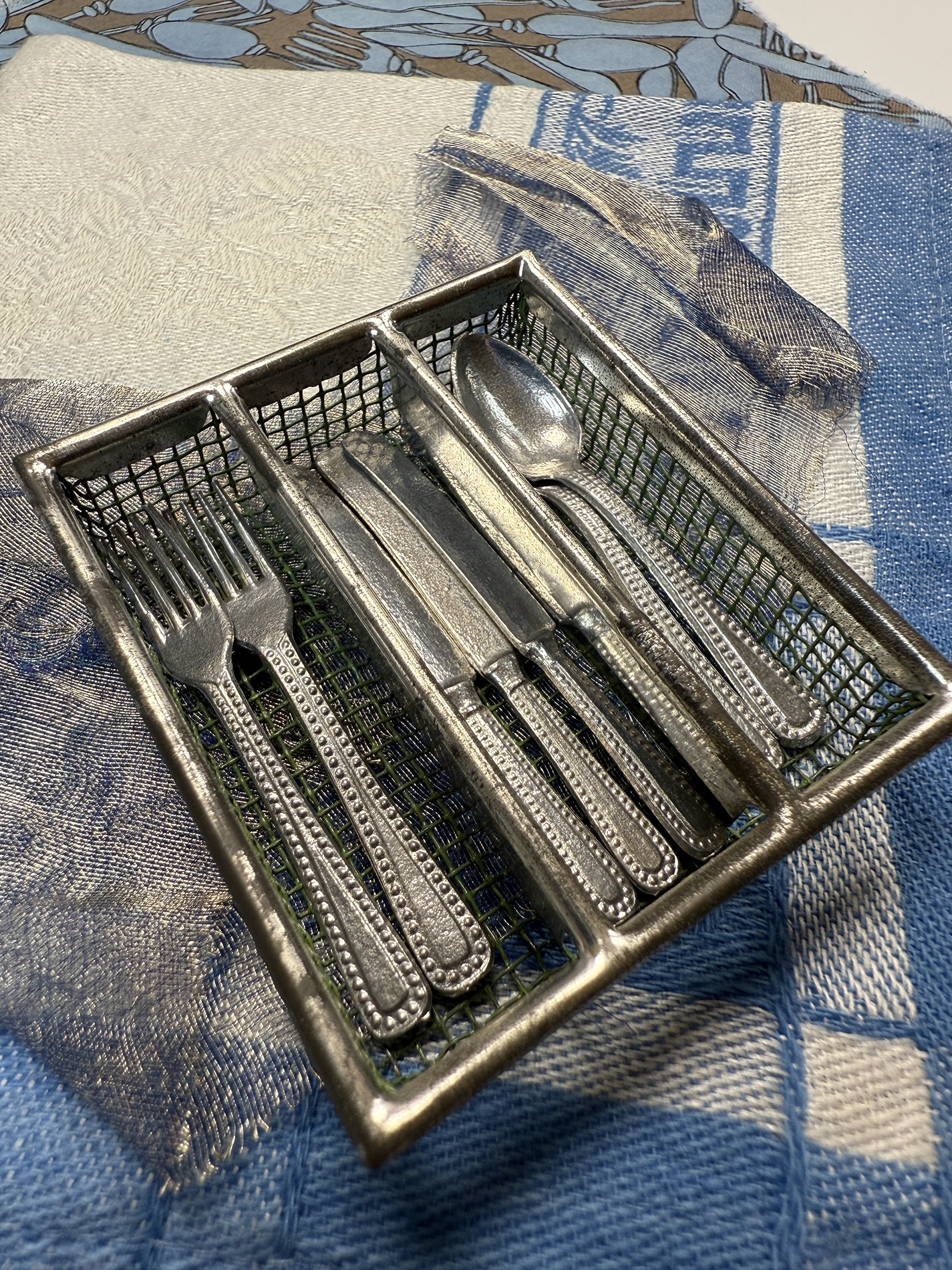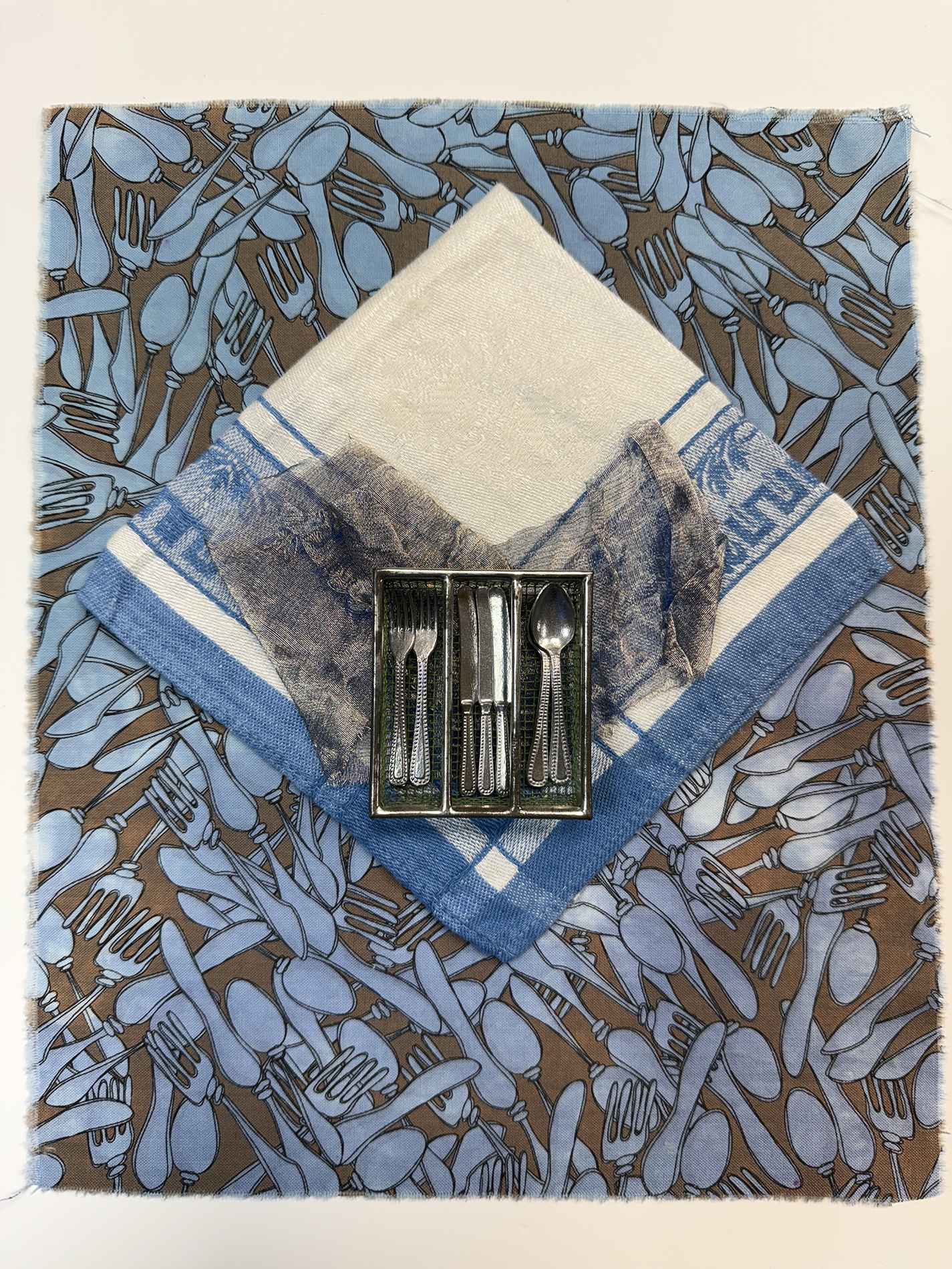 8.5×12″ background fabric, vintage damask napkin, blue silk organza, dollhouse-size table utensils (2″ scale) in tray