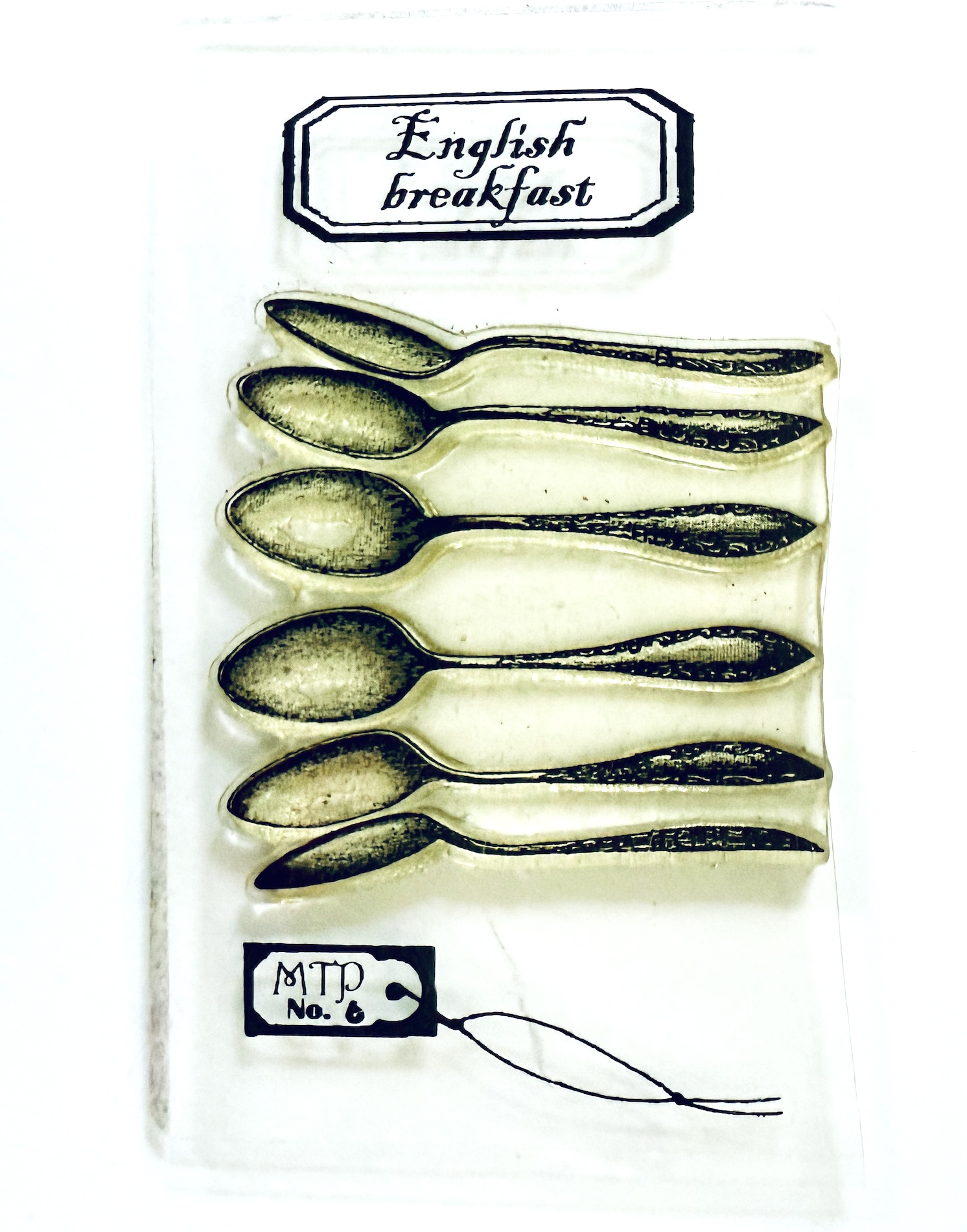 Fragment collage with set of utensils + bonus “serving spoon” and bonus 2×2″ spoons rubber stamp (see additional photo)