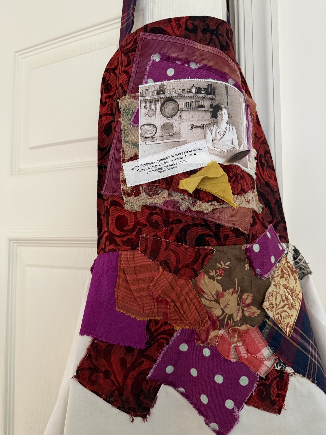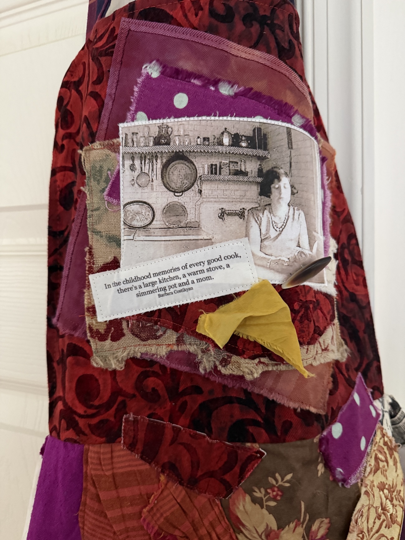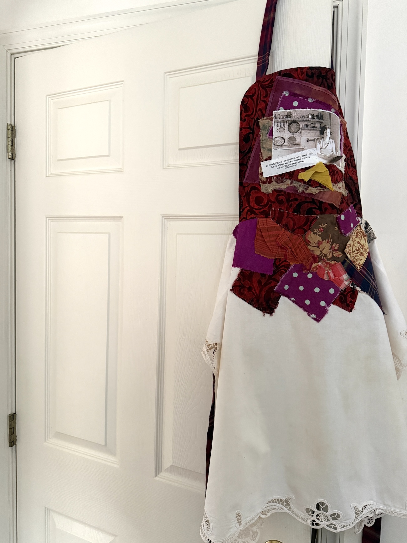 An old lace-edged table cover, some striking fabric, and a little imagination turned these materials into a one-of-a-kind wearable, Fragment apron, with a fabric snippet embellished with a photo of a woman in her mid-century kitchen. A truly relevant quote tops it off. Use it or display it – your choice!