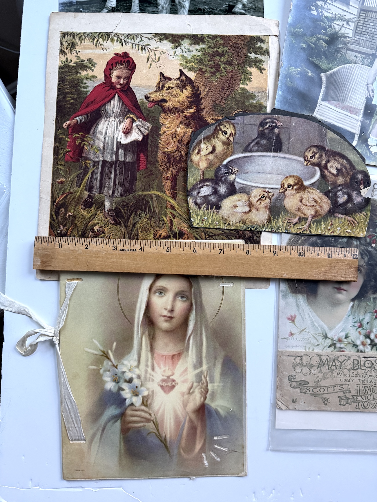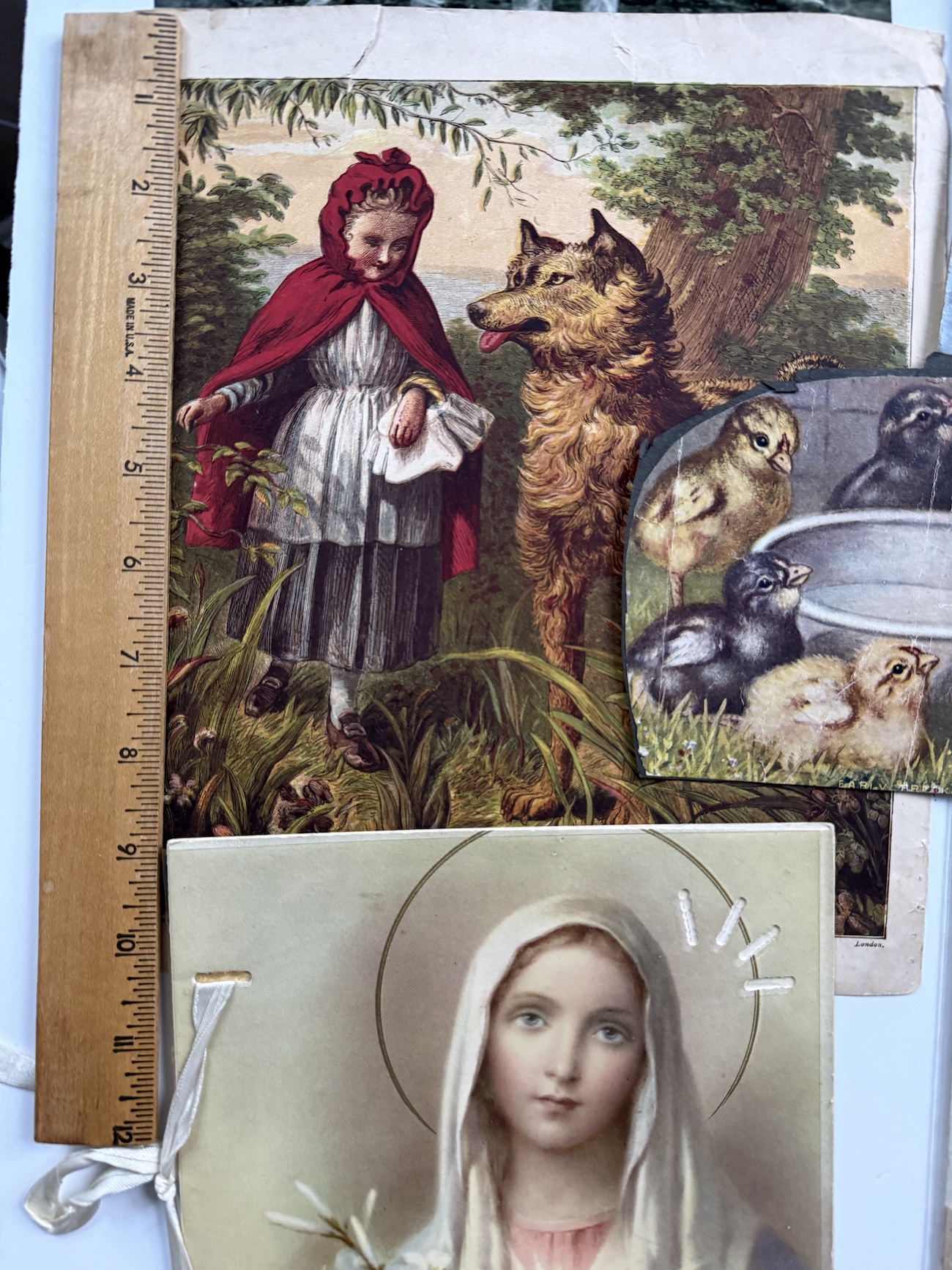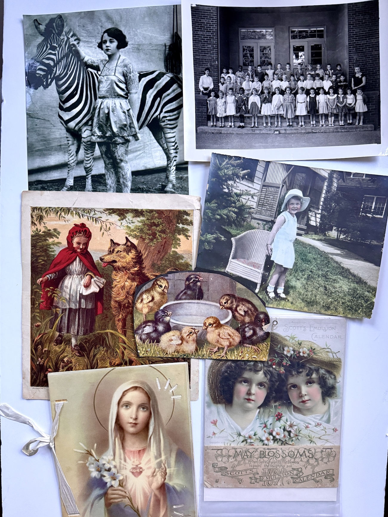 Where else will you find a classis Red Riding Hood print, a circus woman with a zebra, a grade school class, 2 sweet girls from an original 1891 calendar in mint condition, and the Virgin Mary?They are all just waiting for you to turn them into a story, collage, or work of art.