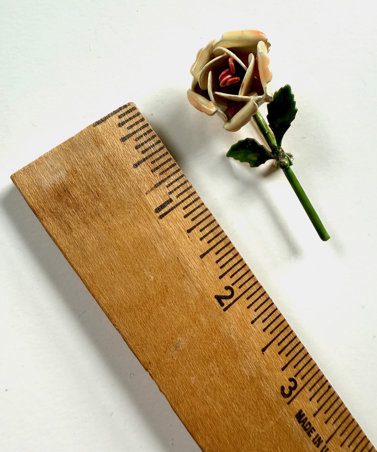 Lovely 2″ x 1/2″ deep vintage, highly collectible by NY jeweler Sandor Goldberger (1938-1972). This is a signed Sandor enamel pin. range online from $30 to $300 online. It’s a steal at this price. Pale pink life-life enamel petals with a deep pink center.