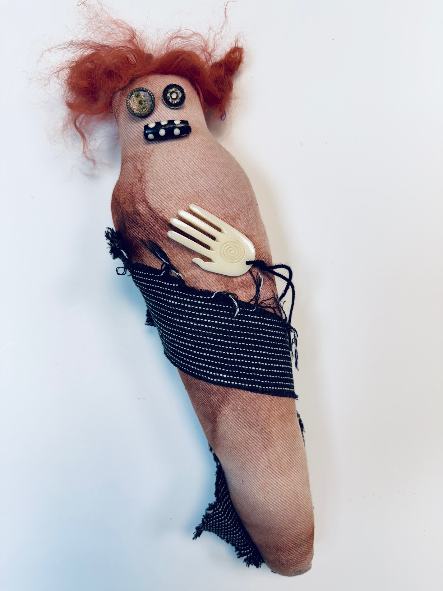 Handmade “mummy” type stuffed doll. Hand-painted body. Metal button eyes, 2″ hand, wrapped with woven fabric.12″ tall